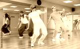 Diligent teenagers leaning back on their toes during modern dance rehearsal in spacious hall