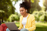 Cheerful Black Student Girl Talking To Laptop Computer Webcam During Online Class Or Webinar Learning Remotely Outdoor, Wearing Earbuds. Virtual Education, E-Learning And Distance Lesson