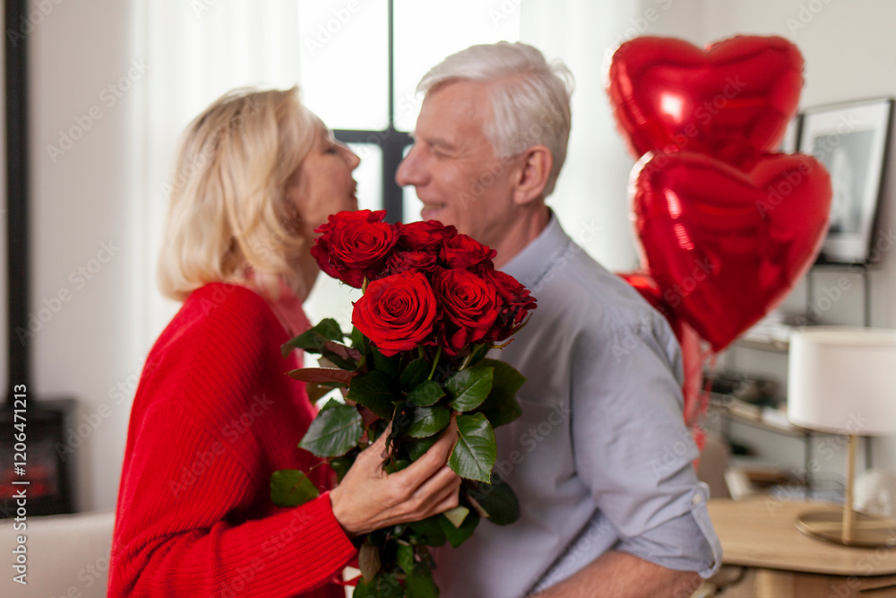 old man senior gives flowers and heart-shaped balloons to his wife and congratulates on the holiday at home, elderly couple celebrates Valentine's Day and makes romantic date