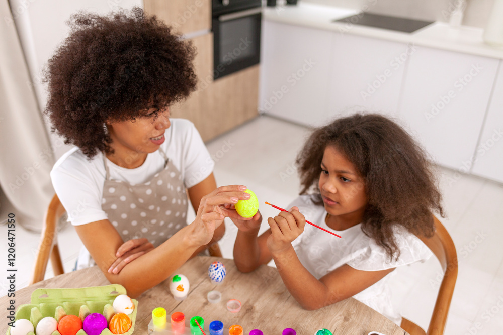African American mother and daughter celebrate Easter and paint eggs with farbe and brush at home, woman with child decorate Easter eggs