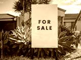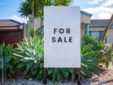 A "FOR SALE" real estate sign placed in front of a modern Australian suburban home. Real estate property listing advertisement board.