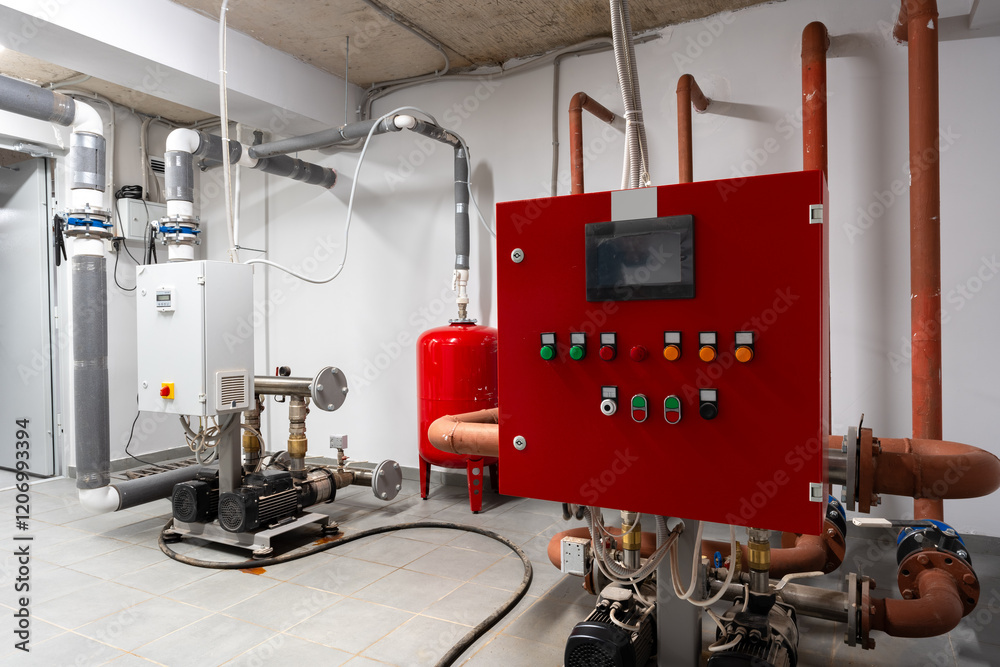 Industrial control room with piping and equipment for managing fluid systems in a commercial facility