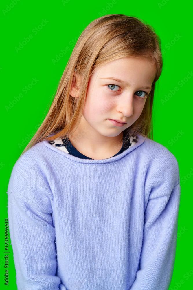 A young child in a light purple sweater gazes against a green background while deep in thought