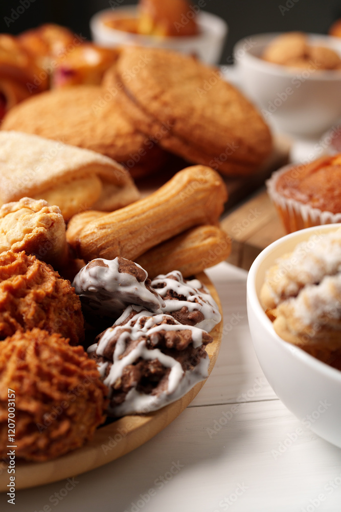 Delicious assortment of freshly baked cookies and pastries on a rustic table setting