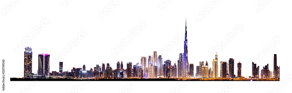 Modern downtown skyline at night with skyscrapers isolated on transparent png