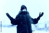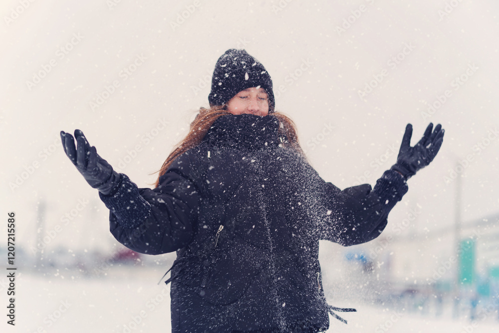 A cute, happy teenage girl in a knitted hat, scarf, and winter clothes joyfully plays under the falling snow. Festive winter mood