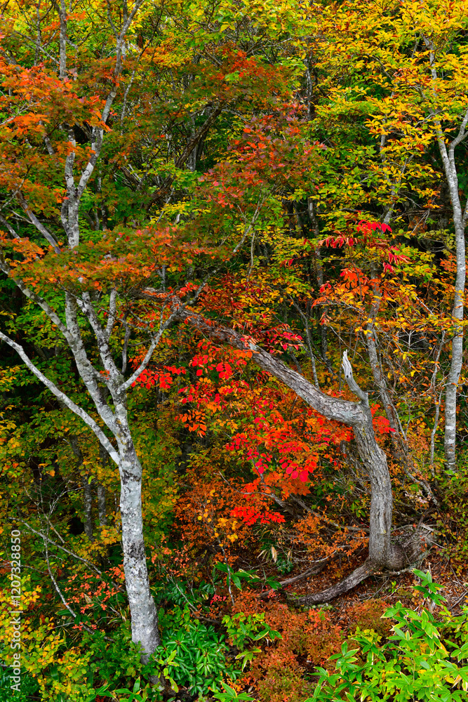 Forest background. Vibrant color tree,Nature change Yellow leaves in october season, Hakuba, Nagano, Japan.