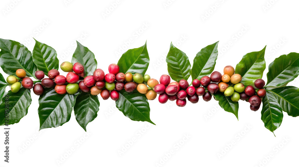 Vibrant coffee beans and green leaves arranged gracefully on a white background, showcasing the rich colors of nature's bounty.
