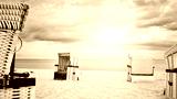 Purple vintage toned hooded wicker basket chairs on an empty beach.