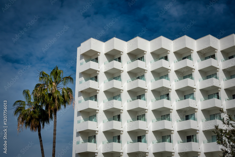 Geometric building background. Architectural detail of a geometrically designed apartment block in Valdelagrana, El Puerto de Santa Maria, Cadiz, Spain. Modern flats. Contemporary architecture.