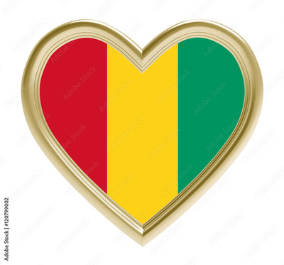 Guinea flag in gold heart isolated on white background. Computer generated 3D photo rendering.
