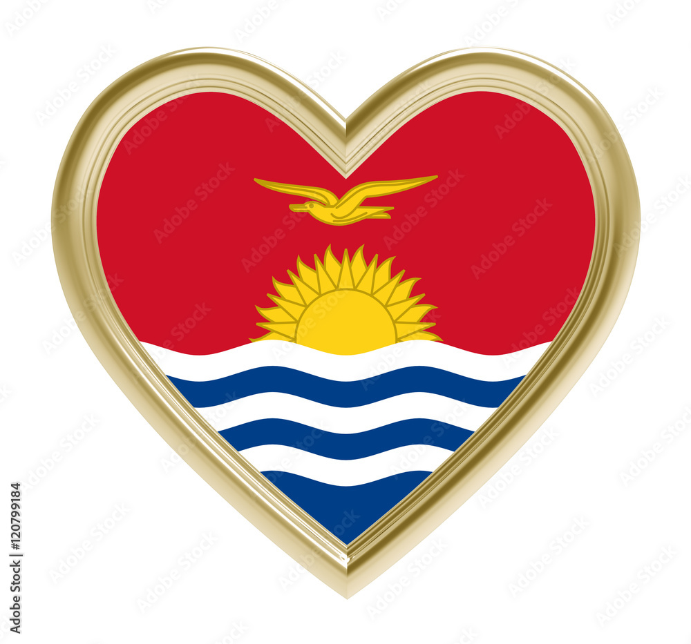 Kiribati flag in golden heart isolated on white background. 3D illustration.