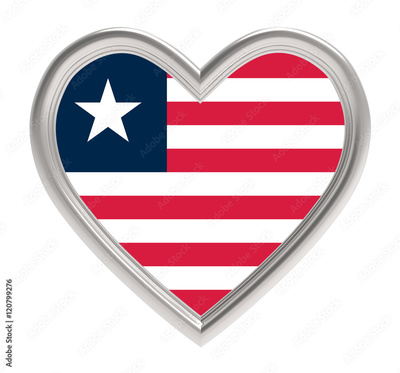 Liberia flag in silver heart isolated on white background. 3D illustration.