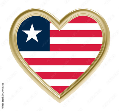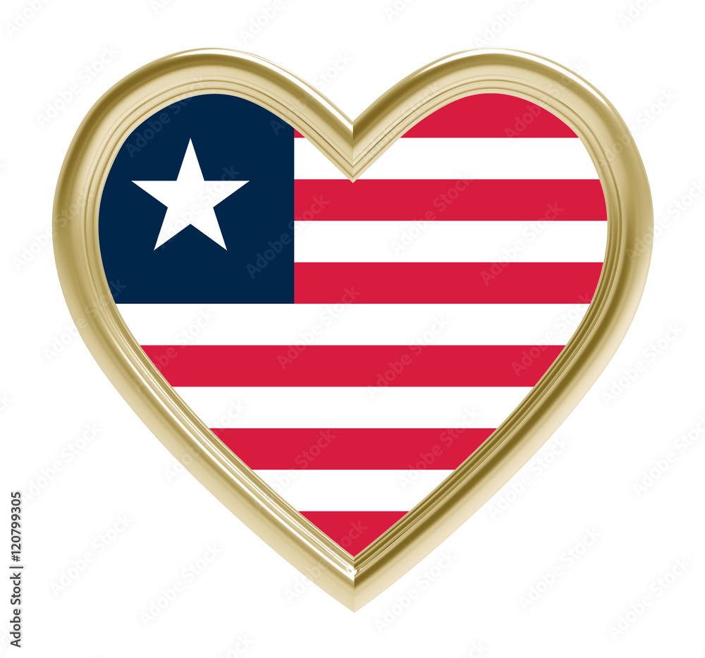 Liberia flag in golden heart isolated on white background. 3D illustration.