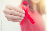 Female hands holding red ribbon HIV, AIDS awareness ribbon, healthcare and medicine concept. retro effect.