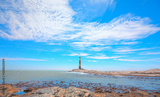 Beautiful red and white lighthouse on the rocks with strong sea wave - Namibia, Africa