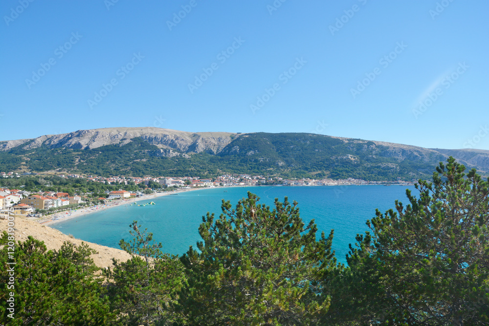 A view of Baska beach (Vela plaza) and the village of the same name, situated by the blue sea, as seen from the rocky western shore of Baska Bay in Croatia