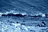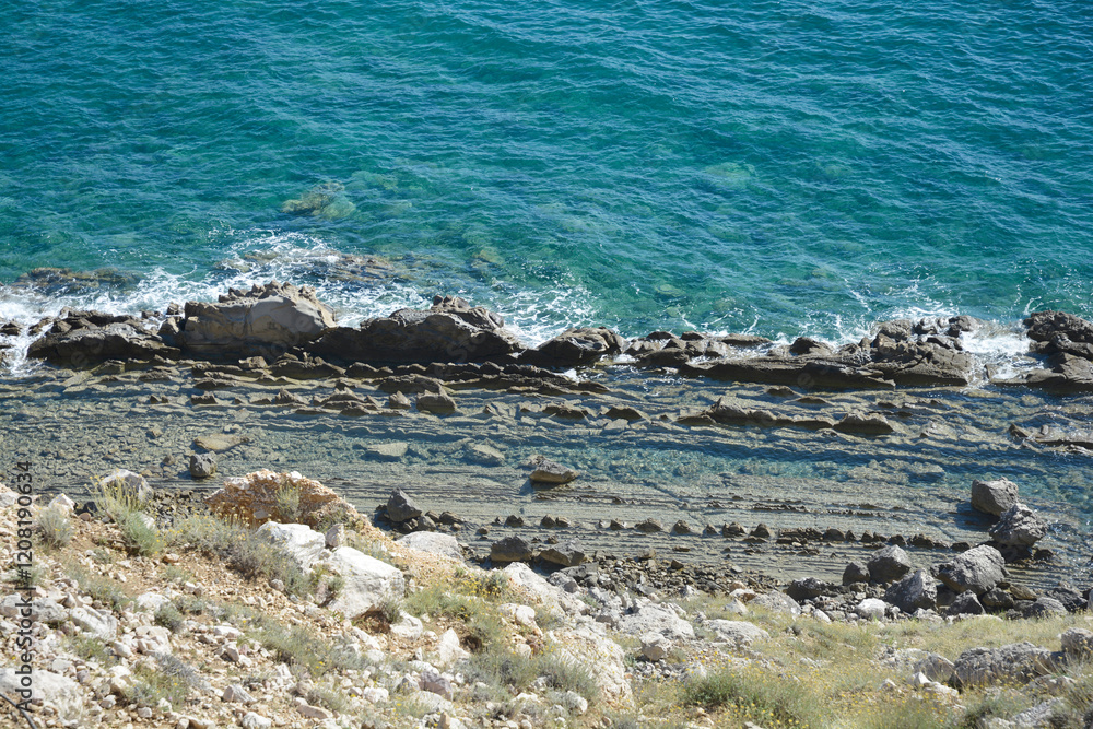 Rocky landscape of the western part of Baska Bay in Croatia, where steep cliffs descend towards the blue sea