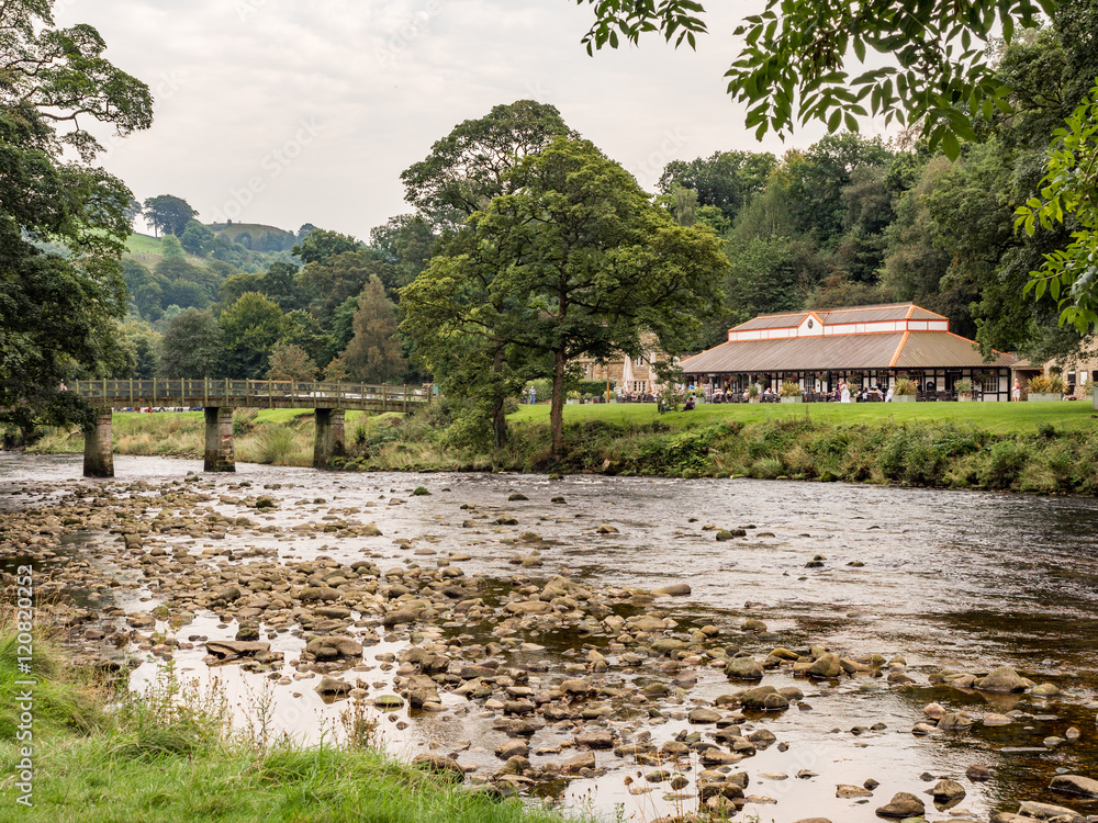 Wooden bridge across the River Wharfe at Bolton Abbey, Skipton, Yorkshire, UK