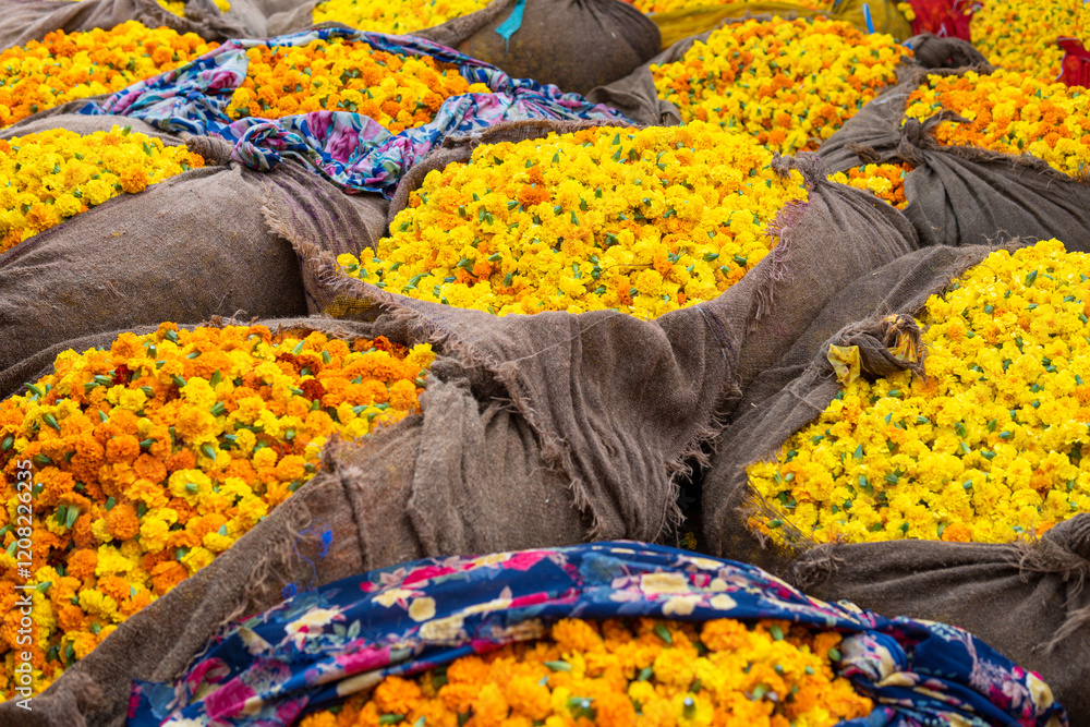 Marigolds and roses flowerheads packed in sacks on Jaipur open market in Rajasthan, India