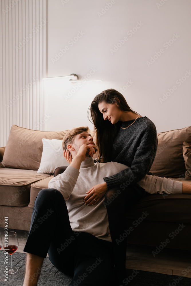 A couple sharing a tender moment on a sofa at home. The peaceful scene captures affection, comfort, and togetherness in a cozy, stylish interior with warm, ambient lighting.