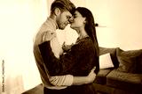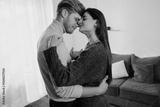 A young couple sharing an intimate moment while standing in a warm, modern living room. Relational intimacy and warmth exude from their expressions, highlighting a romantic and comfortable atmosphere.