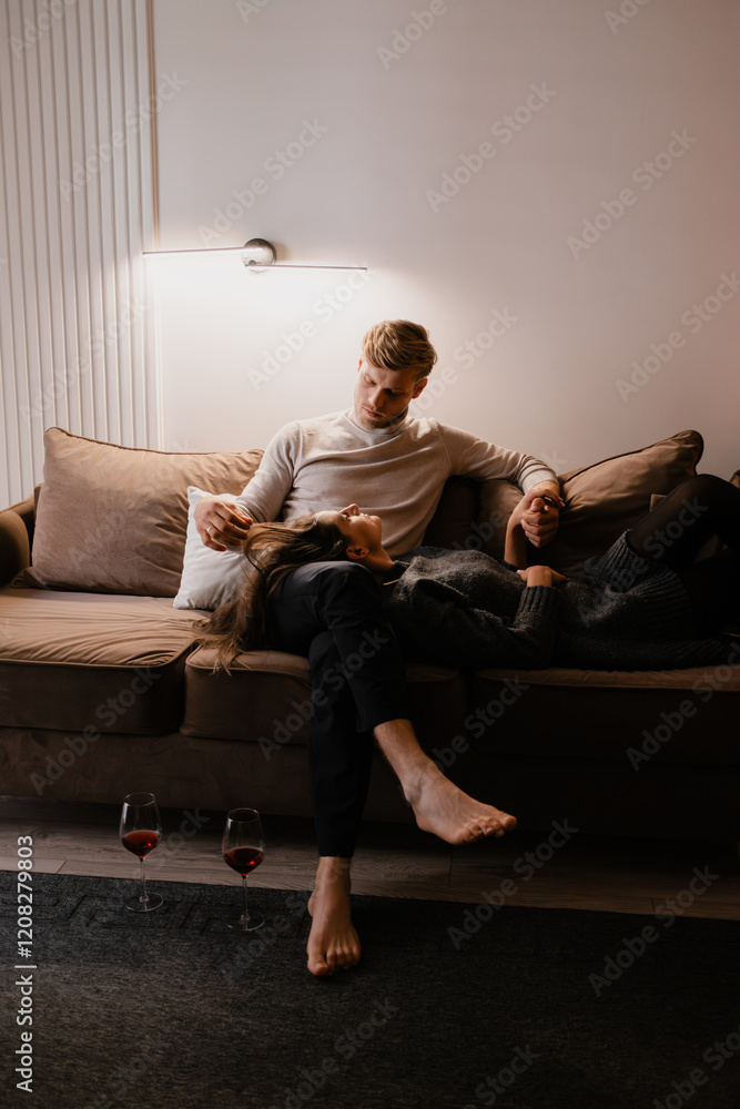 A serene moment depicting a couple enjoying time together on their sofa, illuminated by warm lighting, creating an intimate and tranquil atmosphere with glasses of red wine adding to the coziness.