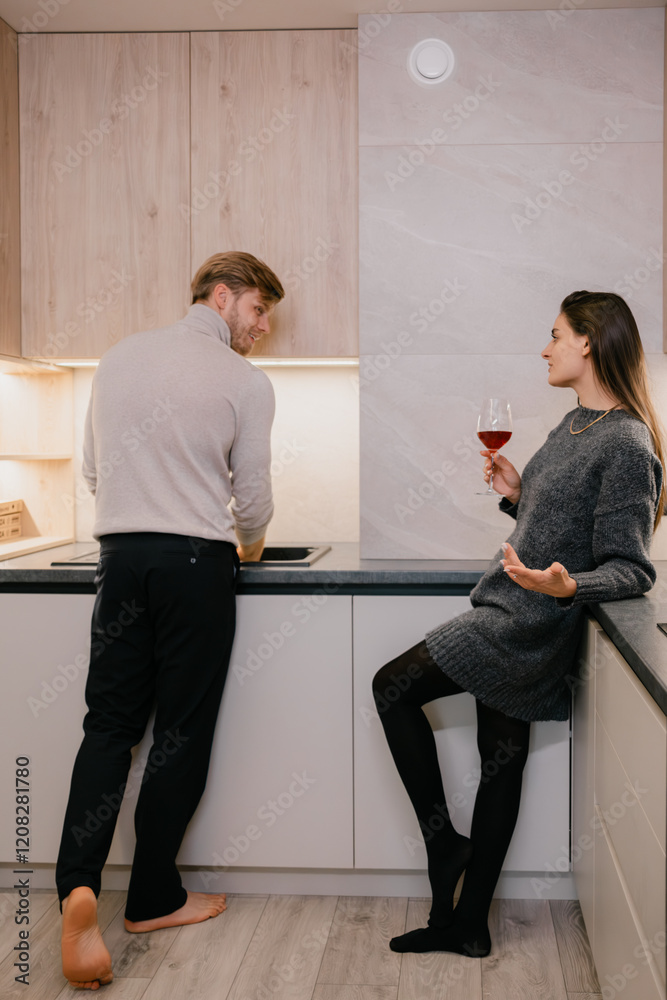 A candid moment of a couple talking and enjoying their time together while cooking in a stylish kitchen. The atmosphere reflects comfort, togetherness, and communication in a cozy home setting.