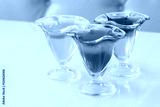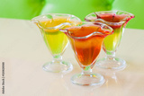Red yellow jelly in glass plate, citrus fruit gelatin dessert beige background. soft focus