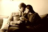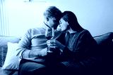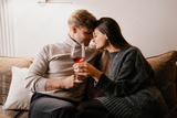 A loving couple sharing an intimate moment at home, holding glasses of red wine, creating a warm and relaxed atmosphere. Perfect portrayal of love, relaxation, and heartfelt connection.