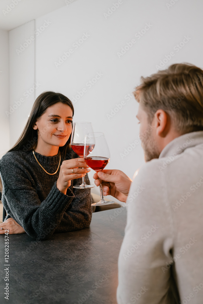 A couple toasting glasses of red wine in a romantic atmosphere, sharing smiles, and enjoying their time together in an inviting and intimate setting.
