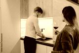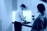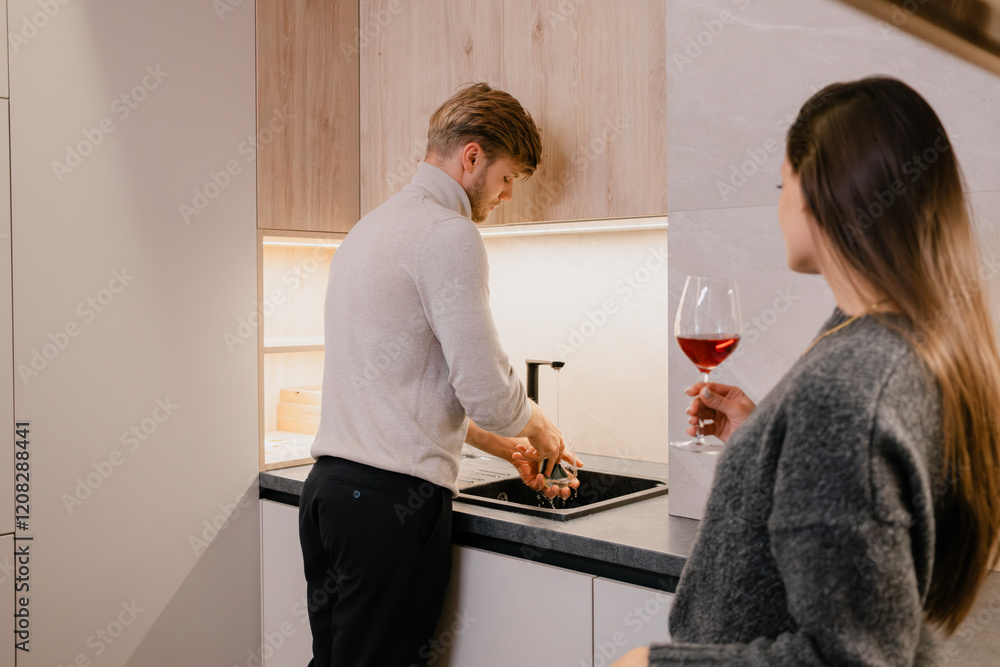 A domestic scene featuring a man cleaning in the kitchen and a woman enjoying wine, symbolizing relaxation, collaboration, and cozy home living.