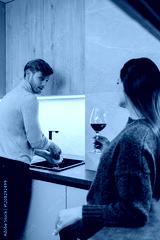 A couple shares a moment in the kitchen, with one washing and the other relaxing with wine.