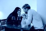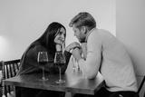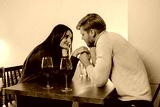 A couple shares a tender moment while enjoying a romantic evening with wine and candlelit ambiance.