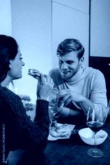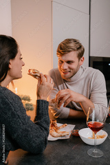 A young couple enjoys a casual dinner with pizza and wine, sharing smiles and warmth in a modern, intimate setting that emphasizes comfort and connection.