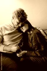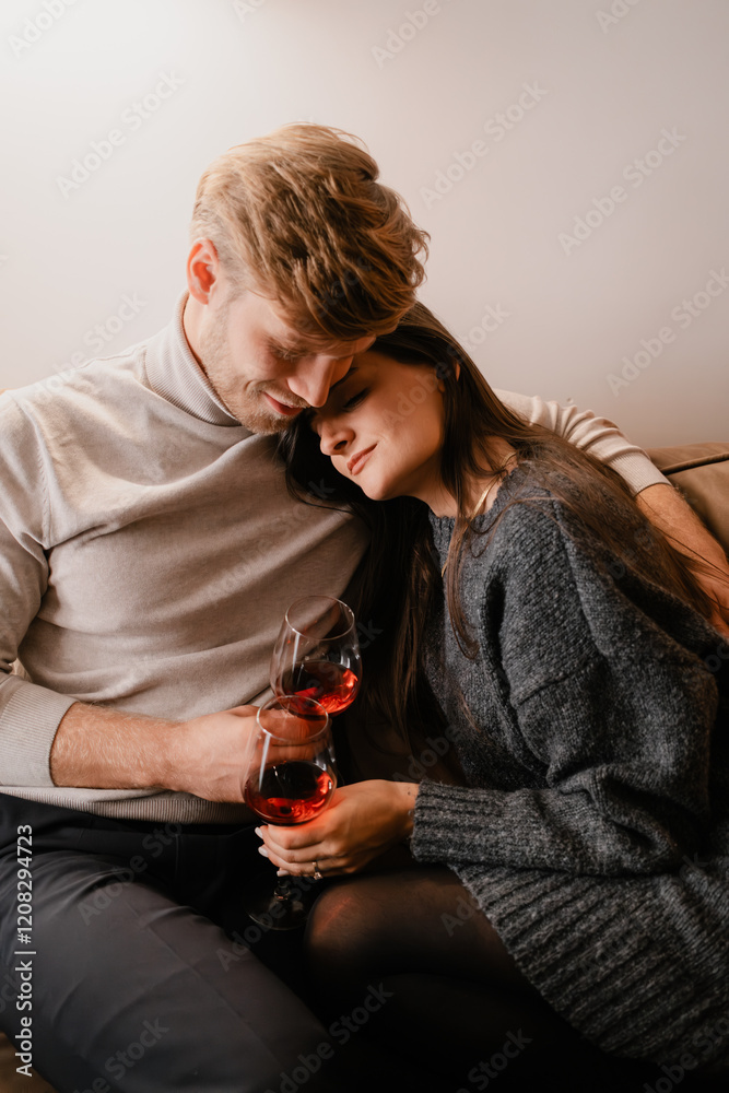 A couple relaxing on a sofa, sharing glasses of red wine in a warm setting. They appear close and affectionate, making the moment feel cozy, intimate, and full of love and relaxation.
