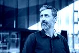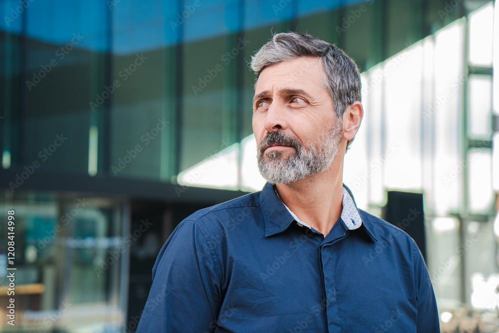 Confident mature man with gray beard gazing thoughtfully into the distance, wearing a navy shirt, standing outdoors near a modern glass building, reflecting professionalism, wisdom, and calmness
