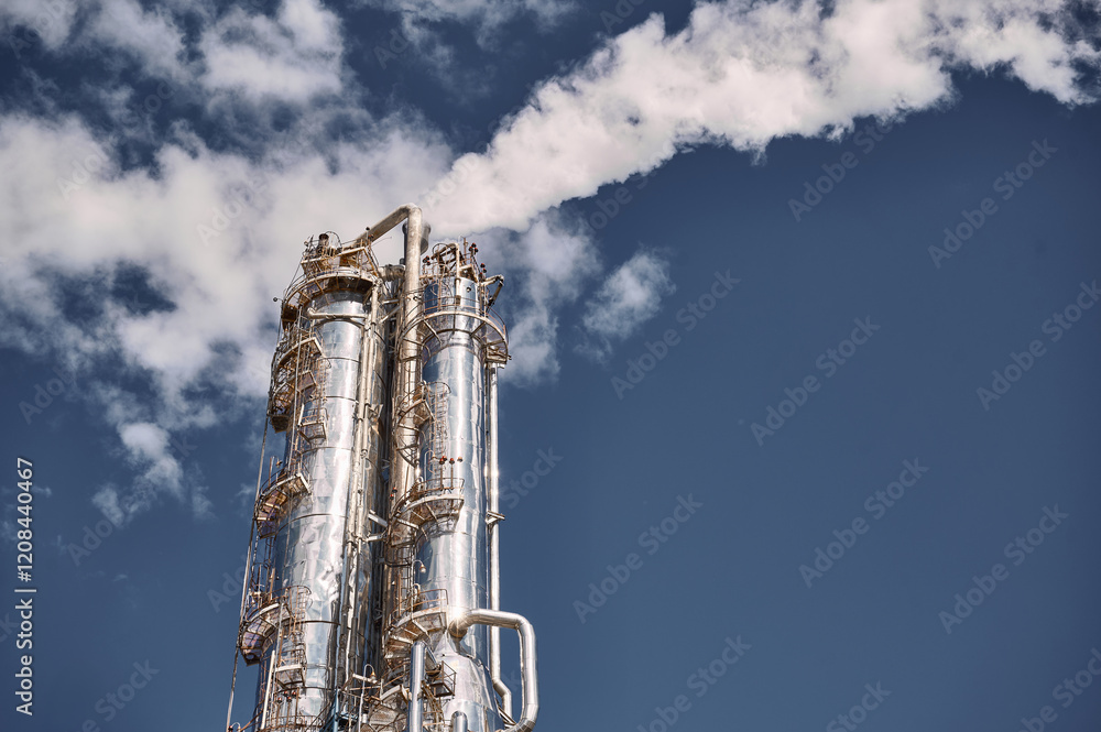 Distillation column releasing steam at a chemical plant under a clear blue sky during daylight