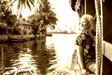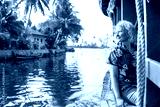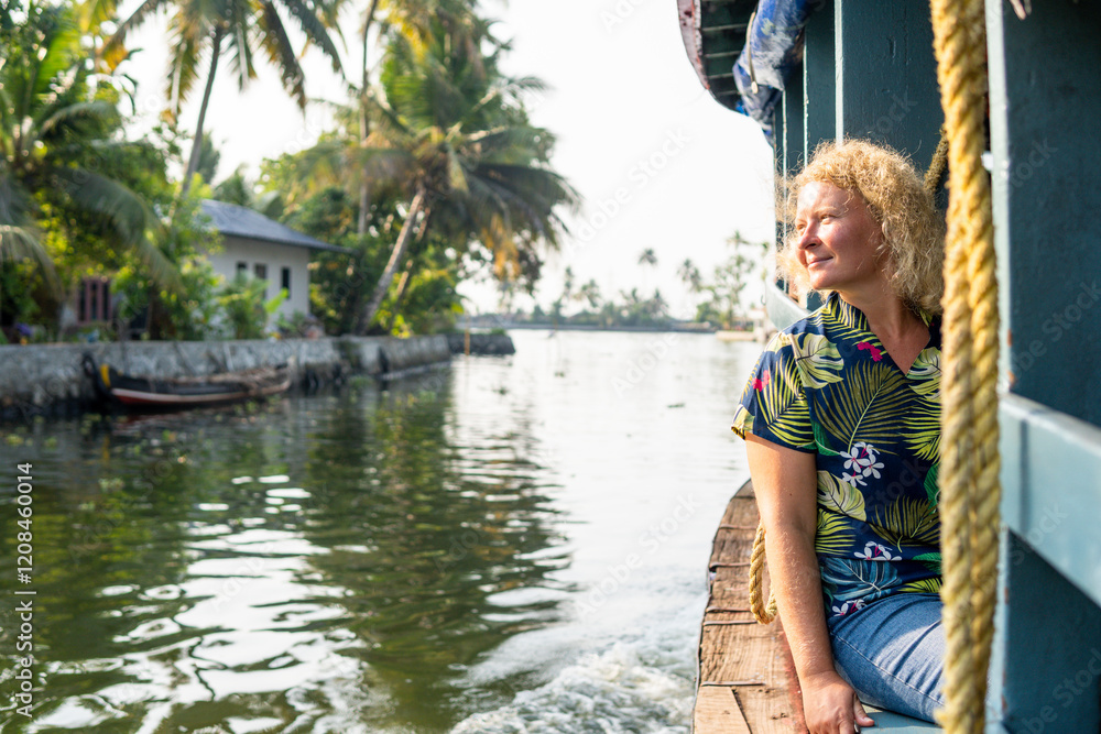 European tourist having a traditional straw houseboat ride on the backwaters of Kerala, India