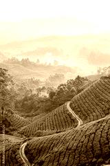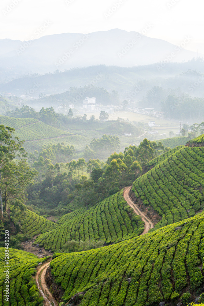 Panoramic view over Munnar tea plantations at sunrise in Kerala, India