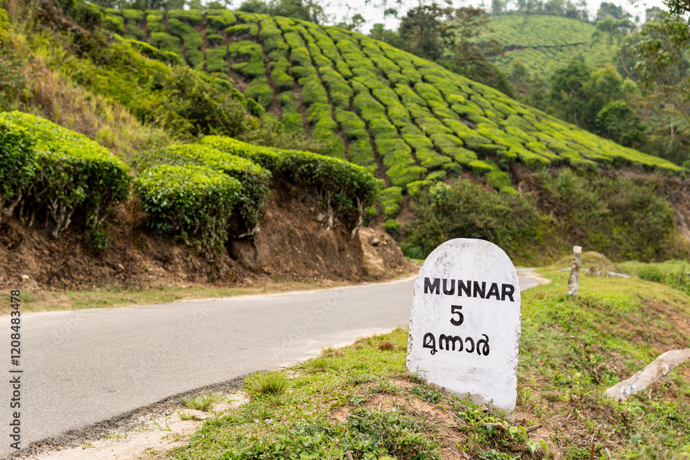 MUNNAR, INDIA - MAY 1, 2024: road sign on tea plantation showing distance to Munnar in Kerala, India