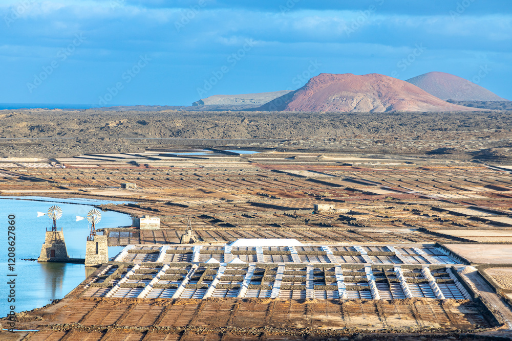 salt mine basins with water mill at Janubio, Lanzarote, Canary islands, Spain