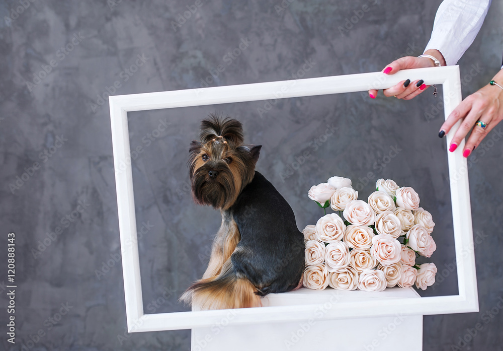 Closeup Portrait of yorkshire terrier dog with a bouquet roses in picture frame