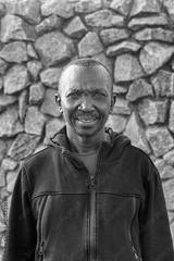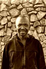 Smiling African man in a black hoodie with a purple shirt underneath, standing outdoors in front of a stone wall, casual and relaxed expression, natural lighting, waist-up portrait african american,