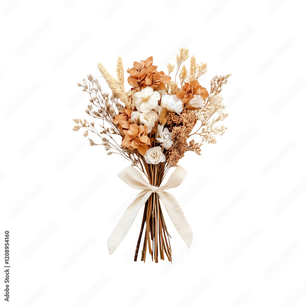 A beautiful bouquet of dried flowers featuring warm tones and delicate textures, Isolated on white background