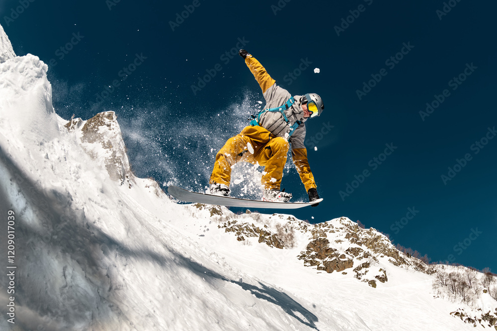 Professional male snowboarder jumps in powder snow from kicker against white snow capped mountains and blue sky. Freeride concept at ski resort