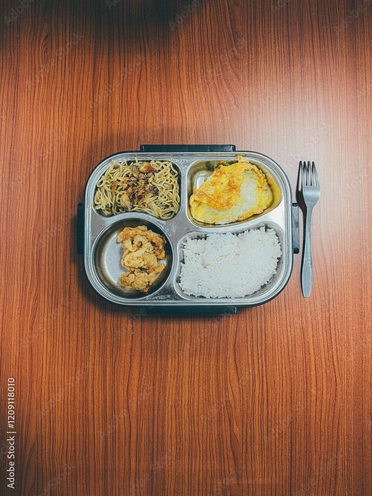 top view of a bento box showcasing a balanced meal of rice, protein, and vegetables