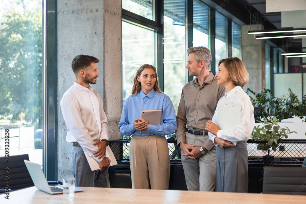 Four business professionals using laptop on desk discussing strategy company