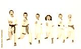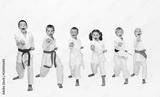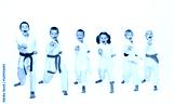 On a light background six karateka beating punch arm