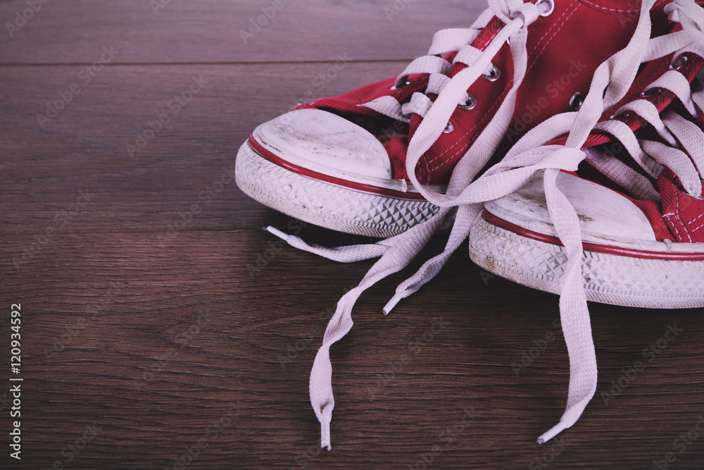 Old canvas shoes on a wooden floor Vintage Retro Filter.
